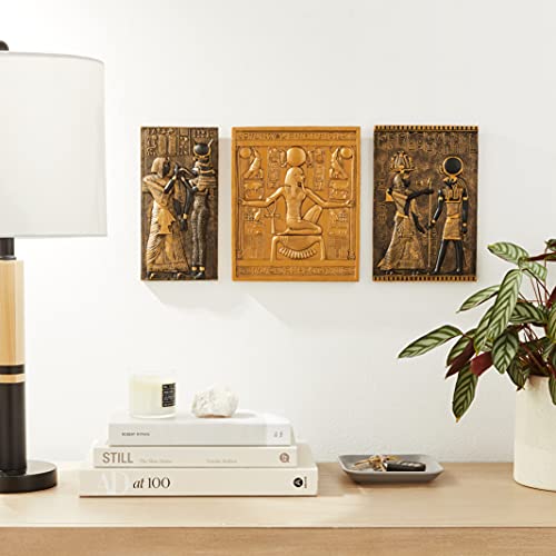 Design Toscano Stele del Tempio Egizio di Tutankhamon, Iside e Horus Targa decorazione da parete, poliresina, bicolore nero e oro, 25 cm, Confezione da tre