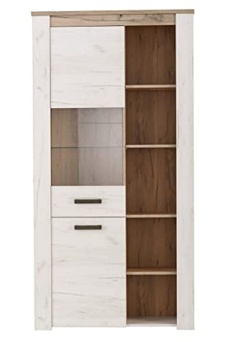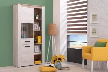 Vetrina_Denmark: Truciolato rivestito con carta melaminica spessore 16 mm e 25 mm, finitura effetto rovere e rovere sbiancato, maniglie nere in acciaio, mensola in vetro, pz per pallet 12, dim, pallet 160x120 cm, da assemblare