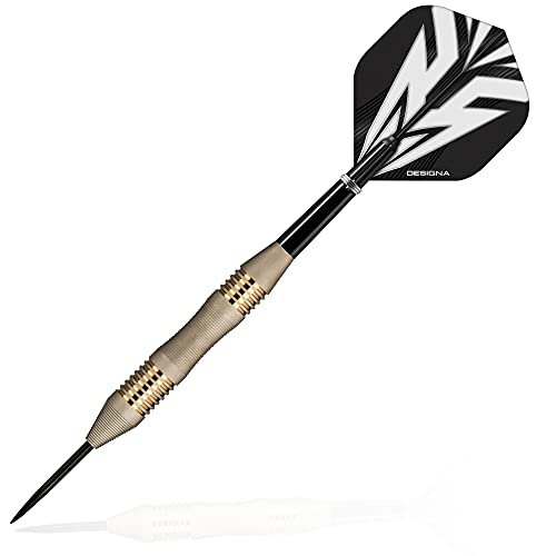Il set include 3 freccette in ottone di alta qualità, 2 set di volanti Designa, alberi in nylon con anelli, una custodia per freccette e una protezione per punti.