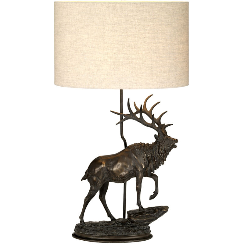 Collezione Angus ADDOBBI DI LUCE Lampada da tavolo a 1 luce con paralume ovale. Grande statuetta di cervo con finitura in bronzo patinato, completa di paralume ovale rivestito in juta naturale.