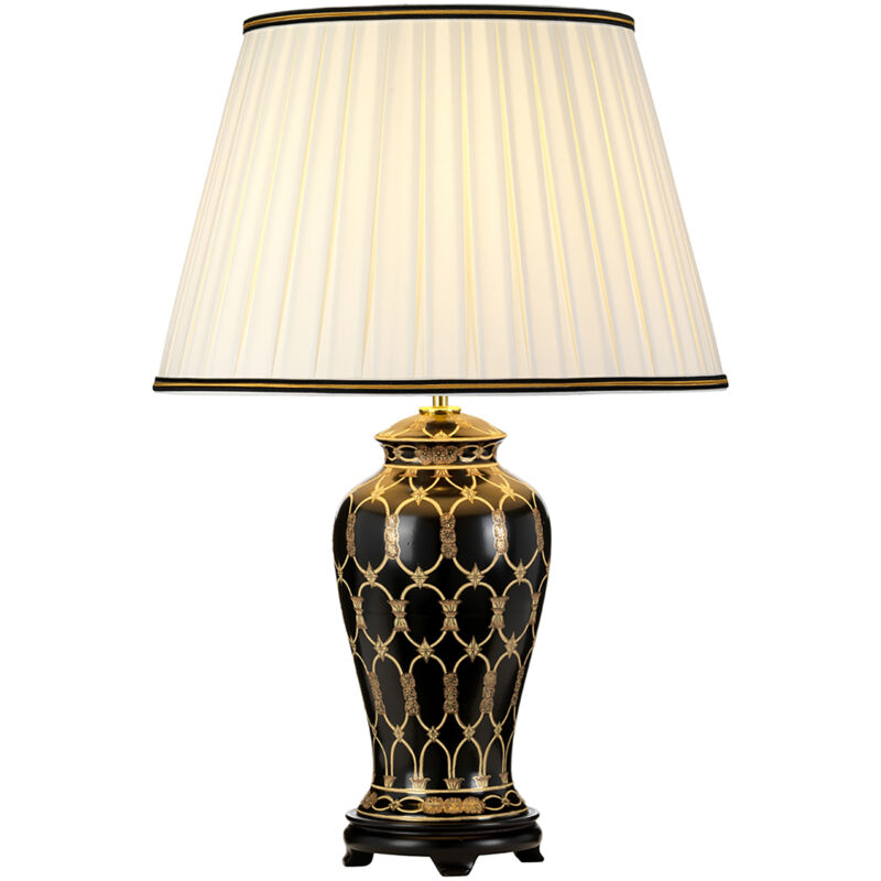 Collezione Taipei CERAMICA ORIENTALE Lampada da tavolo a 1 luce con paralume impero alto. Lampada da tavolo a vaso in ceramica orientale nera con decori in oro e marrone. Compreso un paralume avorio 100% cotone con pieghe piatte doppie e bordi neri e oro.