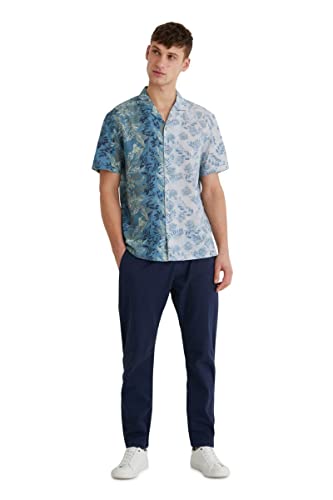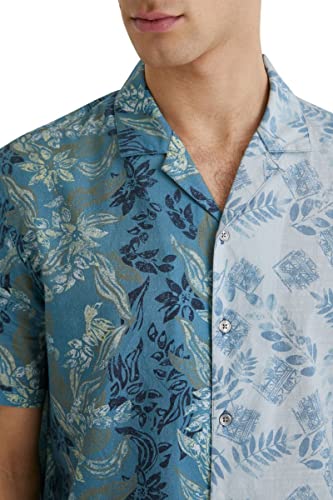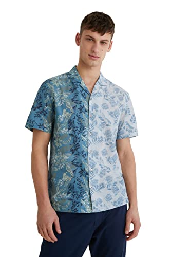 Camicia blu a manica corta in tessuto 100% cotone, chiusura con bottoni e due stampe floreali in tinta metà e metà. Nuova collezione Uomo AI21 Desigual.
