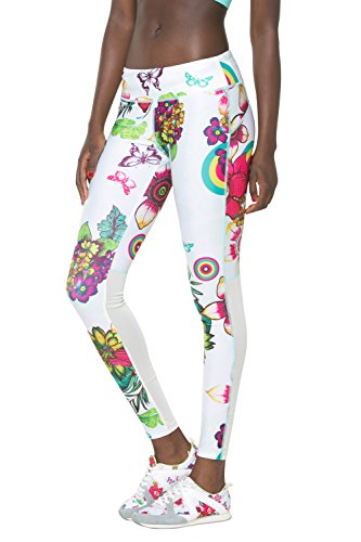 Lunga, multicolore gemusterte calzamaglia per sport in bianco con vita elastica per un' aderenza perfetta, griglia traspirante sulle ginocchia e logo catarifrangente.