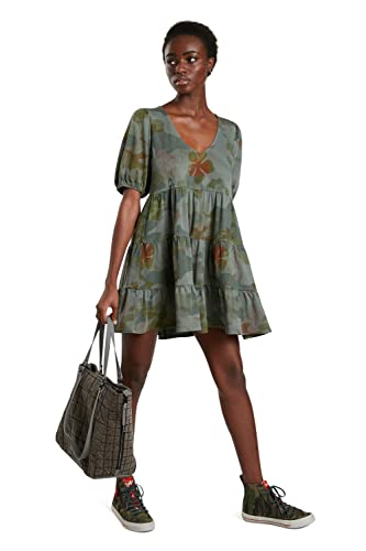 Vestito corto con collo a V, manica corta e strati di balze con stampa di camouflage e fiori. Nuova collezione Donna AI21 Desigual.