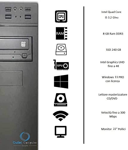 PC Desktop Computer Completo - SSD 240GB - WINDOWS 11 PRO 64 BIT - WIFI - HDMI - VGA - TASTIERA E MOUSE USB CASSE AUDIO... (CPU: I5 - RAM 8GB, MONITOR 22")