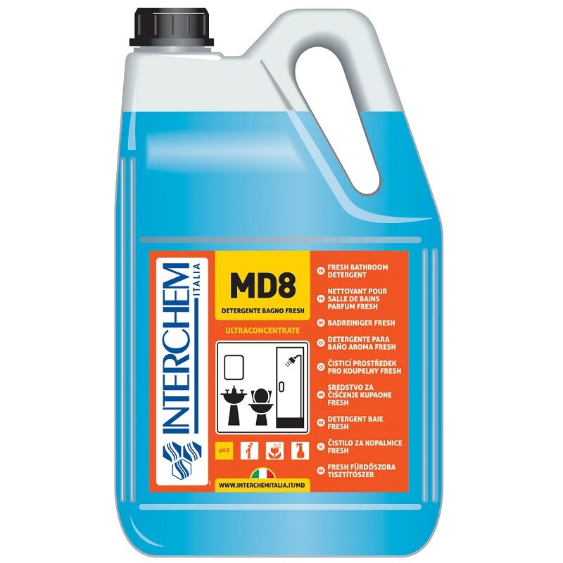 A COSA SERVE Detergente disincrostante profumato ultraconcentrato per la creazione di prodotti pronti all'uso per la pulizia giornaliera e la disincrostazione di tutte le superfici lavabili del bagno. Svolge un'azione sanificante, brillantante, profumante e anticalcare. Ideale per rimuovere e prevenire le incrostazioni, lo sporco e i residui di sapone da tutte le superfici lavabili del bagno come: piastrelle, rubinetterie, sanitari, box doccia, specchi, lavandini, ecc. Lascia nell'ambiente una gradevole e duratura nota profumata di felce talcata e le superfici trattate lucide e protette per molto tempo. MD8 Detergente Bagno Fresh si utilizza manualmente con panno o spugna e si risciacqua velocemente grazie alla bassa formazione di schiuma. Non utilizzare su marmo o pietra naturale. DOSAGGIO CONSIGLIATO Diluire il prodotto nell'apposito flacone da 750 ml con i seguenti STRUMENTI DI DILUIZIONE: Monodose 40 ml - 1 monodose;