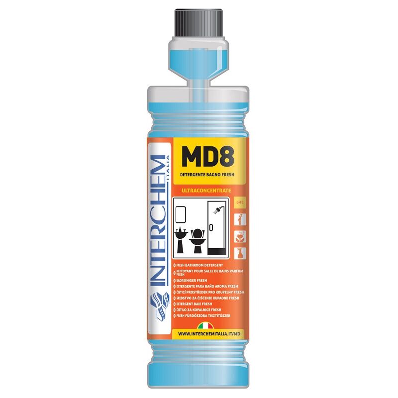 A COSA SERVE Detergente profumato ultraconcentrato per la creazione di prodotti pronti all'uso per la pulizia giornaliera di tutte le superfici lavabili del bagno. Svolge un'azione sanificante, brillantante, profumante e anticalcare. Ideale per rimuovere e prevenire le incrostazioni, lo sporco e i residui di sapone da tutte le superfici lavabili del bagno come: piastrelle, rubinetterie, sanitari, box doccia, specchi, lavandini, ecc. Lascia nell'ambiente una gradevole e duratura nota profumata di felce talcata e le superfici trattate lucide e protette per molto tempo. MD8 Detergente Bagno Fresh si utilizza manualmente con panno o spugna e si risciacqua velocemente grazie alla bassa formazione di schiuma. Non utilizzare su marmo o pietra naturale. DOSAGGIO CONSIGLIATO Diluire il prodotto nell'apposito flacone da 750 ml con i seguenti STRUMENTI DI DILUIZIONE: Monodose 40 ml - 1 monodose;