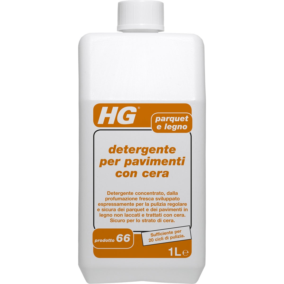 HG detergente per pavimenti con cera (HG prodotto 66) è un detergente dalla profumazione fresca sviluppato espressamente per la pulizia regolare e sicura dei parquet e dei pavimenti in legno e trattati con cera. La composizione unica di questo prodotto lo rende un detergente eccezionale che non intacca lo strato di cera. Diluire 50 ml (mezza tazzina) di prodotto in un secchio contenente acqua tiepida per metà della sua capienza (5 l). Quindi passare o strofinare il pavimento con un panno o un mocio ben strizzati, immergendoli spesso e accuratamente nella soluzione creata. Non sciacquare o rimuovere il detergente e lasciare asciugare il pavimento da solo. 1 litro di prodotto è sufficiente per 20 cicli di pulizia.. indicato per pavimenti e parquet non verniciati. non intacca lo strato di cera