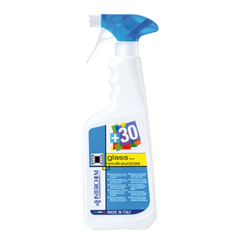 Spray detergente Glass and Multi-Purpose. Spray 750 ml. Detergente per la pulizia di vetri, specchi, cristalli e per lo spolvero di tutte le superfici lavabili. Evapora rapidamente senza lasciare aloni lasciando una gradevolissima nota profumata. CARATTERISTICHE - Non lascia aloni - Profumazione gradevole - Indicato anche per vetri molto sporchi MODALITA' D'USO Spruzzare una piccola quantità di prodotto puro sulla superficie da pulire ed asciugare con panno o carta. pH 7