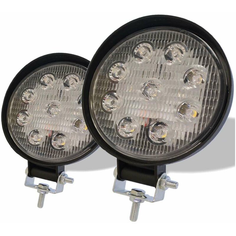 Fari LED tondi 27W Kit da 2 pezzi Modello: 2x27W LED Sono presenti 9 led in ogni faretto e sono di colore bianco 6000K. Dotati di protezione IP67, hanno un'alimentazione di DC 10-30V e sono costruiti in PU / alluminio che insieme al dissipatore di calore prevengono il surriscaldamento del faro garantendo un'ottima funzionalità. Nella confezione è incluso il kit staffe e viteria per il montaggio.