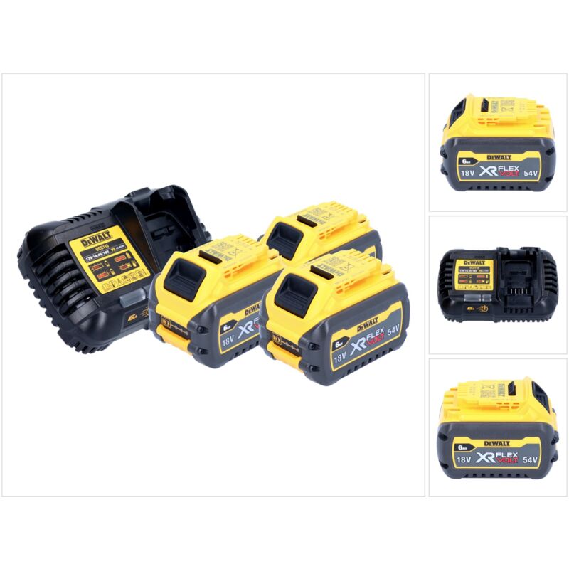 Contenuto della consegna: - 3x batteria DeWalt DCB 546 XR FlexVolt 54 V / 18 V 6,0 Ah - 1x caricabatterie DeWalt DCB 116 XR Descrizione del prodotto: La batteria DCB 546 XR FlexVolt convince per la sua elevata potenza di 108 Wh ed è quindi particolarmente adatta per applicazioni estremamente gravose e di lunga durata. La DCB 546 è compatibile con tutte le macchine XR da 18,0 Volt e può essere utilizzata in un'ampia gamma di applicazioni. Grazie a un'elettronica speciale, il DCB 546 è dotato di un'efficace protezione contro il sovraccarico, il surriscaldamento e la scarica profonda. Il DCB 116 DeWalt è un potente caricabatterie appositamente progettato per le batterie agli ioni di litio DeWalt da 12 V, 14,4 V e 18 V XR. È stato progettato per offrire una tensione di carica di 220 - 240 V e una corrente di carica di 6 ampere. Con un peso di soli 700 g e dimensioni di 200 x 130 x 70 mm, è molto compatto e facile da trasportare. Il DCB 116 DeWalt è la soluzione ideale per prolungare la
