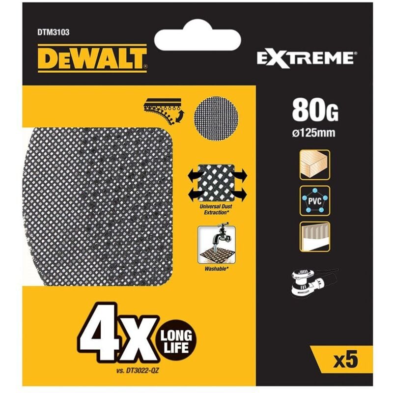 Confezione da 5 maglie di carta vetrata grana: 80 ø125mm. Per levigatrici rotorbitali Dewalt DTM3103-QZ. i fogli abrasivi a rete hanno almeno 4 volte la durata della tradizionale carta vetrata dewalt e offrono . Fino al 25% di miglioramento della finitura superficiale. ideale per legno, metallo, vernice, intonaco e superfici verniciate marca: dewalt modello: dtm3103-qz tipologia: fogli abrasivi a rete caratteristiche: lunga durata (durata 4 volte più)