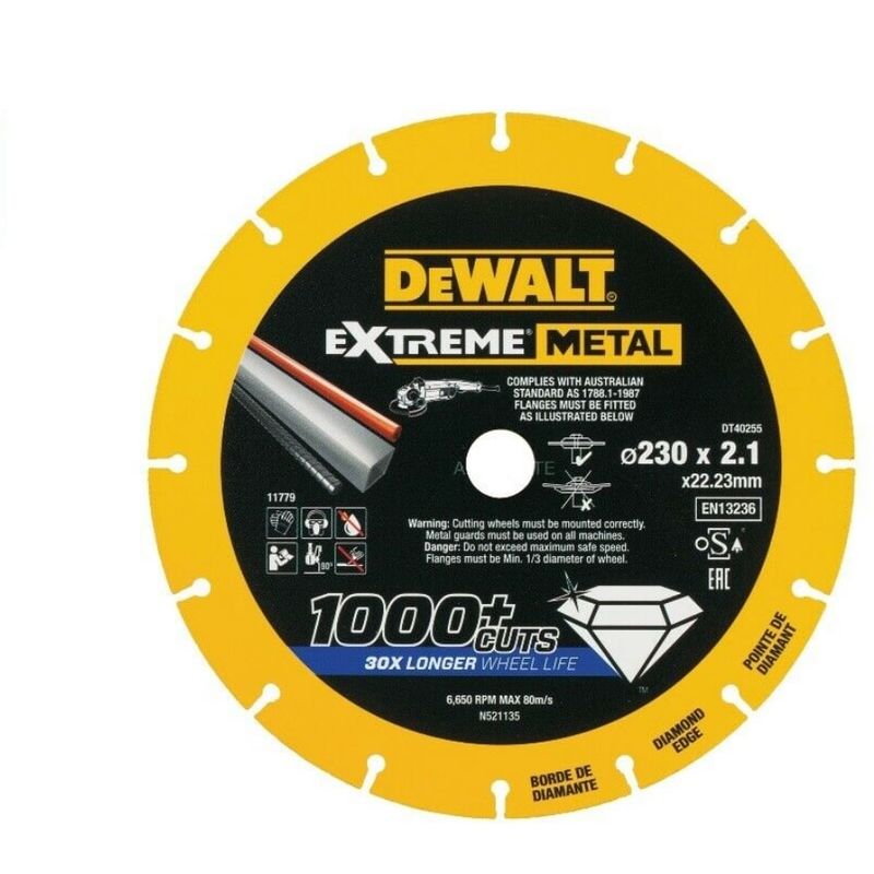 DEWALT DT40255 Disco Extreme Diamond diamantato per taglio metalli diametro 230 mm con durata e prestazioni estreme per oltre 1000 tagli. CARATTERISTICHE - 1000+ tagli: il Disco Extreme Diamond � realizzato con diamante che taglia il metallo ed � legato alla superficie del disco con una nuova tecnologia;