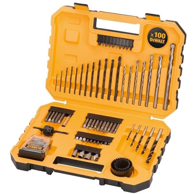 Kit 100 accessori per forare e avvitare in valigetta Kit in valigetta composto da 100 pezzi: 12 punte per metallo: 1,5-2-2,5-3-4-4,5-5-5,5-6-6,5 mm 5 punte per legno: 3-4-6-8 mm 7 punte per muratura: 5-5,5-6-7-8-10-12 mm 2 seghe a tazza 32-44 mm 1 mandrino per seghe a tazza 1 punta a svasare 1 adattatore magnetico 15 inserti misti da 50 mm 53 inserti misti da 25 mm