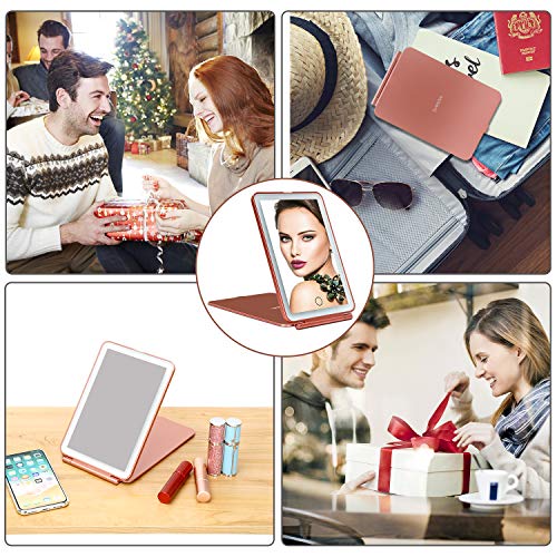 Deweisn Specchio da trucco a LED, da viaggio, 32 LED, con supporto regolabile e dimmerabile, compatto, sottile, ricaricabile, pieghevole, specchio illuminato per bellezza (oro rosa)