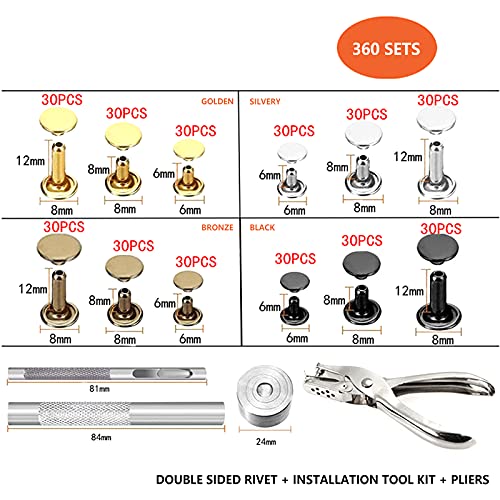[3 diverse dimensioni]: 360 set di rivetti a doppio cappuccio sono disponibili in 3 diverse dimensioni: 6 mm x 6 mm, 8 mm x 8 mm e 8 mm x 12 mm per pelletteria e artigianato di vari spessori;