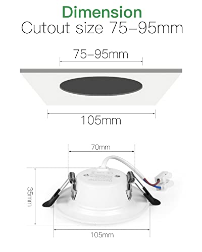 【Certificati CE e RoHS】Dexnump faretti led da incasso per cartongesso dimensioni ottimali e sono ultrasottili. il diametro esterno è di 104 mm, quello del foro di installazione va da 75 a 95 mm, con una profondità della scanalatura di 35 mm. CRI> 85, questo elemento contribuisce a una migliore percezione dei colori degli oggetti illuminati, più simile ai colori reali.