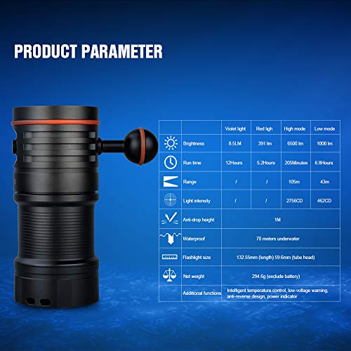 Torcia tascabile a LED super luminosa per immersioni subacquee. 6500 LUMEN: luce bianca (inondazione) con temperature di colore di 6000K la lampada subacquea professionale, che può raggiungere i 150 gradi, può fornire una luminosità di 6500 lumen sott'acqua.