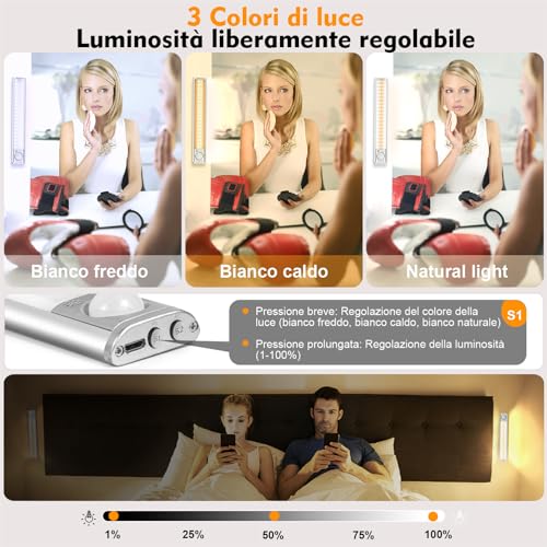 [Colore e luminosità regolabili] Questo led sensore movimento, Con 40 LED per ogni luce cucina, Le lampada notturna led sensore dell'armadio incorporano 160 LED. Le luci armadio possono facilmente cambiare tra 3 colori di led armadio e diverse intensità luminose in base alle tue esigenze.Le nostre luce sensore movimento armadio possono soddisfare le tue diverse esigenze.