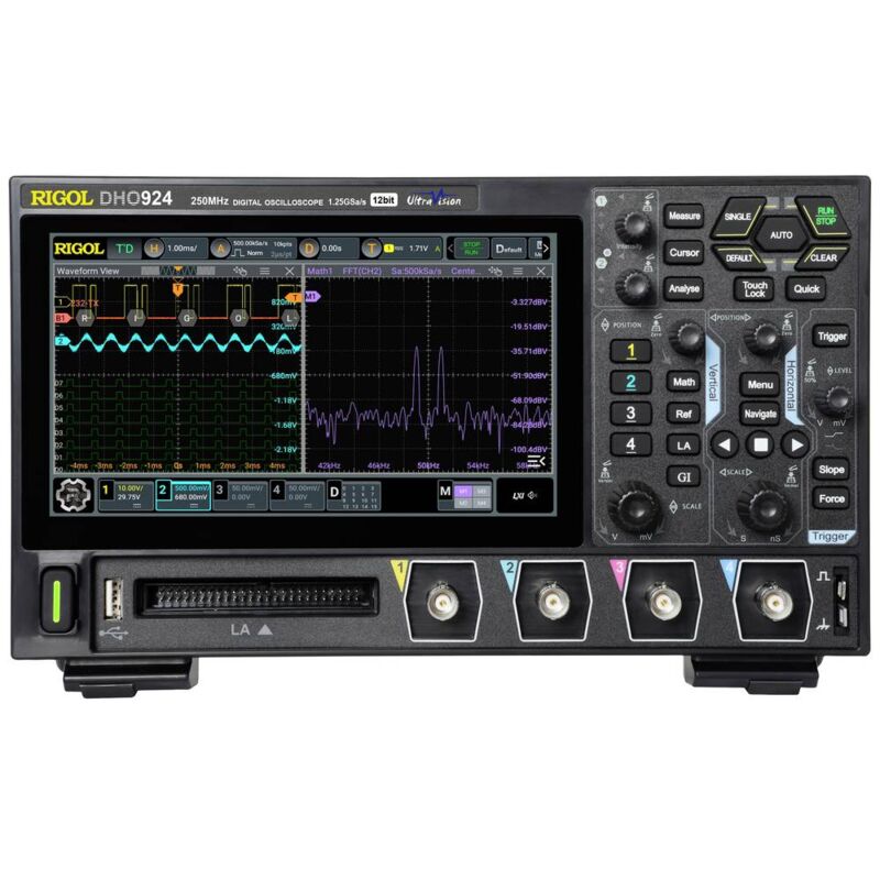 Dettagli tecnici Ampiezza di banda 200 MHz Calibrato di fabbrica senza certificato Categoria di misura (LOV) CAT I Dimensione del prodotto, larghezza 265.35 mm Dimensione del prodotto, lunghezza 77.38 mm Dimensioni (L x L x A) 77.38 x 265.35 x 161.75 mm Dimensioni prodotto Altezza 161.75 mm Ingressi digitali max. 16 Interfacce (componenti) LAN, Dispositivo USB, USB-C, HDMI Numero max. Ingressi analogici 4 Peso 1.78 kg Risoluzione (metrologia) 12 Bit Tipo prodotto Oscilloscopio digitale Oscilloscopio multifunzione digitale compatto La serie DHO900 è il nuovo oscilloscopio digitale RIGOLs, potente ed economico. Nonostante il suo design compatto offre prestazioni superiori. Offre una velocità di rilevamento fino a 1.000.000 wfms/s (in modalità UltraAcquire), una profondità di memoria di 50 Mpts, una risoluzione di 12 bit e un rumore ridotto. È compatto e portatile, in modo che possa essere facilmente utilizzato sul banco da lavoro, in classe, nei terreni di prova e in altri scenari di