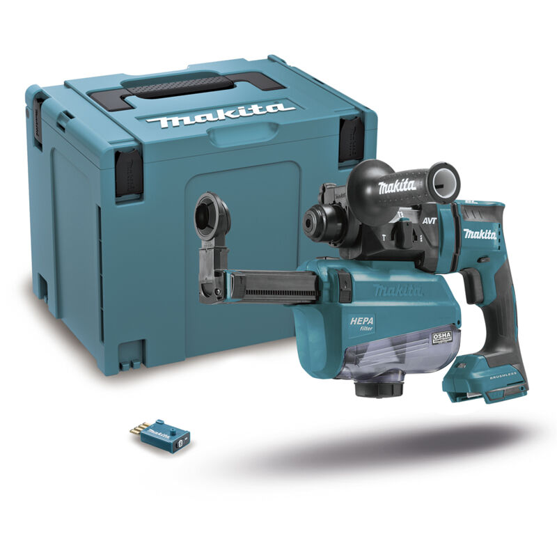 MAKITA DHR182ZWJU BL Martello leggero a batteria 18V LXT 18 mm AWS Martello combinato a batteria 18V. 18 mm. Include set di aspirazione e AWS. Vantaggi per l'utente 3 modalità operative per molteplici applicazioni. Tecnologia antivibrante AVT è progettata per ridurre le vibrazioni per maggiore comfort. AWS utilizza la tecnologia Bluetooth per la comunicazione on/off wireless tra lo strumento e l'aspiratore di polvere. Efficiente sistema di filtraggio HEPA che cattura il 99,97% delle particelle di 0,3 micron o più grandi. Il controllo costante della velocità applica automaticamente potenza aggiuntiva al motore per mantenere la velocità sotto carico ed affrontare i lavori più impegnativi. La frizione con limitazione di coppia previene i danni rilasciando automaticamente le marce in caso la punta si blocca. L'aspiratore di polvere integrato è dotato di un meccanismo di pulizia del filtro progettato per aiutare a mantenere un'efficienza di aspirazione ottimale. Il motore BL Brushless