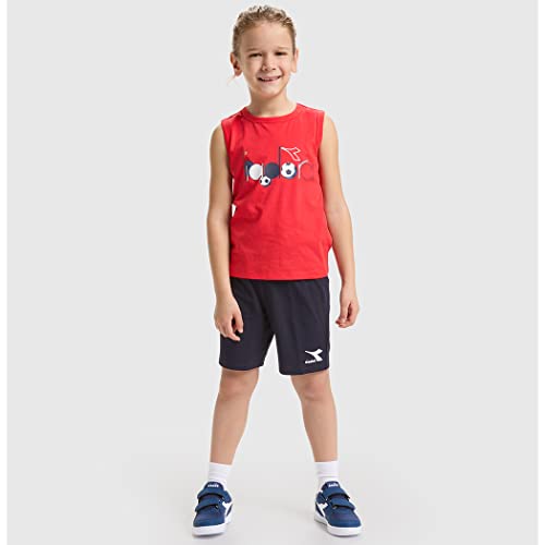 Completo Diadora da bambino composto da t-shirt giromanica con stampa colorata sul davanti e bermuda con comode tasche laterali e logo in contrasto posto sulla gamba
