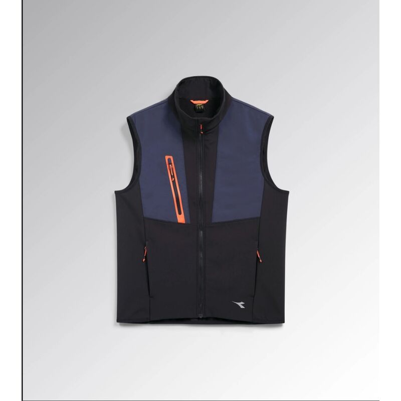 Gilet bimateriale softshell più Nylon nella parte superiore. Due tasche laterali con zip ed una tasca frontale con dettaglio fluo termonastrato. Parte posteriore più lunga per miglior vestibilità.