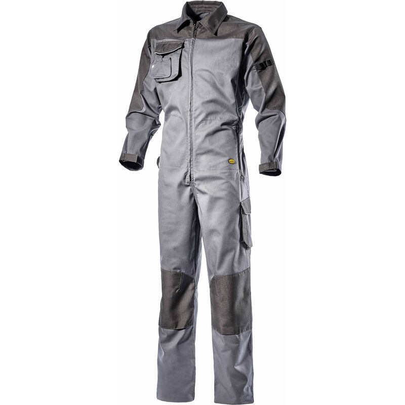 Tuta con contrasti canvas in poliestere antiabrasione su spalle, gomiti e ginocchia, zip doppio cursore. Tasche portamartello e portametro, tasche laterali, dettaglio materiale elastico sulla schiena per agevolare il movimento, elastico in vita, dettagli rifrangenti, porta badge, tripla cucitura.