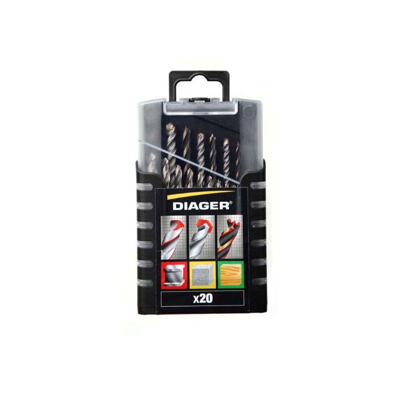Dettagli: In questa confezione troverete un set di 4 punte per calcestruzzo, 4 punte per metallo e 12 punte per legno della gamma professionale Diager. Ciascuna punta per calcestruzzo è dotata di un inserto in metallo duro per impieghi gravosi con affilatura semi-positiva, una doppia elica arrotolata con coclea per una rapida estrazione della polvere e una finitura sabbiata. La geometria specifica della testa assicura una foratura veloce per garantire un'elevata velocità di lavoro nei vostri cantieri. Queste punte possono essere utilizzate anche in pietra, mattoni, blocchi e cartongesso. Le punte per metalli HSS sono molto versatili e possono forare acciai non legati e legati fino a 900/nm². È possibile forare la ghisa a grafite laminare e la ghisa a grafite laminare speciale. Hanno tutte un angolo di punta di 118°, elica di tipo N, tolleranza di diametro h8 e un attacco massimo di 12,7 mm. Tutte le punte per metallo sono conformi alla norma DIN 338 e sono tagliate e rettificate in