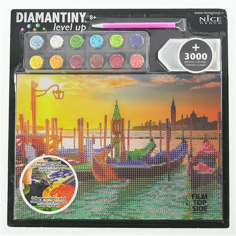 DIAMANTINY LEVEL UP: è la nuova attività crystal art per creare mosaici fai-da-te, in rilievo, con coloratissime gemme 3D. Disponibile nella versione Landscape Venice da gemmare. TECNICA: per decorare il mosaico delle Gondole a Venezia devi utilizzare la tecnica crystal art, colora con i numeri, applicando le gemme ai numeri. Il foglio di istruzioni ti guida nellapplicazione. FUNZIONE: questa attività è molto semplice e rilassante. Aiuta i bambini e i giovani a sviluppare la manualità, la coordinazione e la concentrazione. CONTENUTO: il set contiene 1 quadretto di cm 21x29,5 con base adesiva e guida colore, 3000+ cristalli colorati, 1 vassoio raccoglitore, 1 penna con cui applicarli e 1 quadretto di cera. Età consigliata: 8
