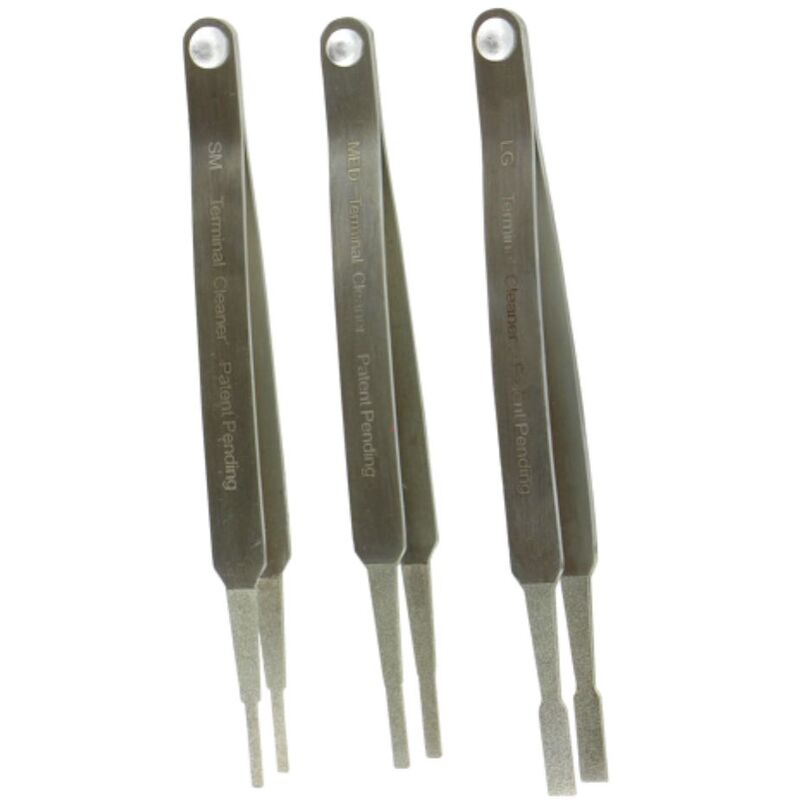 Tre pinzette di macinazione per la rimozione della corrosione nell'alloggiamento della spina, senza danni ai contatti sensibili. Le pinzette e i collegamenti a spina possono essere puliti su morsetti a penna piatti (vanga). Inoltre, le cosce di pinzette possono essere ruotati e quindi consentire un uso più versatile e flessibile. Con l'uso di questo set brevettato, può essere migliorata la conduttività dei composti elettrici per la diagnosi dirompente sull'oggetto.