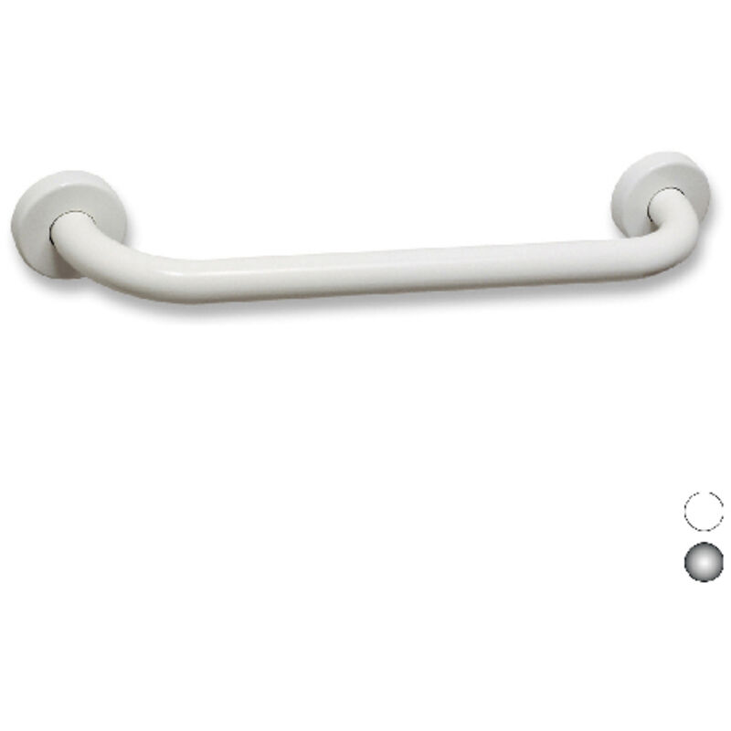 Maniglione di sicurezza con fissaggio a muro realizzato in acetalico (materiale plastico ad altissima resistenza) studiato in collaborazione con il Politecnico di Milano per rispondere alle seguenti esigenze: 1) resistenza a carichi sul maniglione di almeno 150 kg, 2) perfetto isolamento elettrico per evitare la trasmissione di correnti vaganti.Vite di fissaggio in acciaio inox.