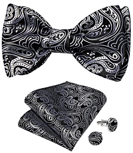 DiBanGu Set di papillon da uomo in seta con motivo floreale cachemire, papillon annodato e gemelli quadrati tascabili, per feste di nozze e affari, Argento nero, Taglia unica