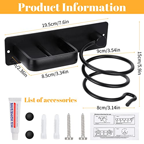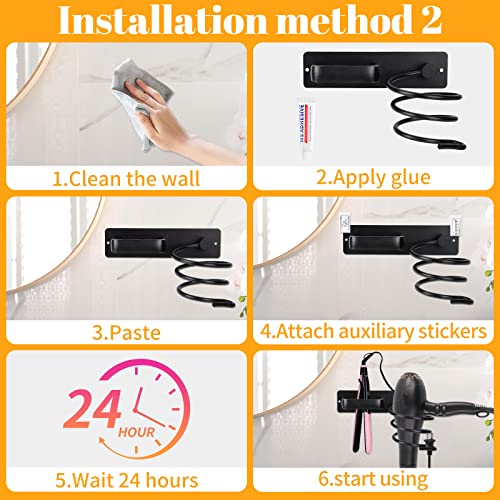 【Facile Installazione】Metodo di installazione1:colla+adesivo ausiliario,nessuna perforazione,protezione del muro,adesivo ausiliario per fissare il supporto dell'asciugacapelli,consigliato dopo 24 ore dall'installazione.Metodo di installazione 2:l'organizer per viene fornito con viti complete,si attacca alla parete con fori perforati per aiutarti a montarlo sulla parete(copertura nascosta con fori per le viti per migliorare i'estetica generale).