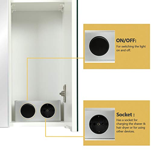 ✅【Con Presa】L'angolo inferiore destro dell'interno armadietto bagno è una pratica combinazione d'interruttore della luce e presa impedisce solo all'acqua di entrare nella presa, ma comodo anche per accendere e spegnere la luce LED, ricaricare il rasoio o usare l'asciugacapelli.
