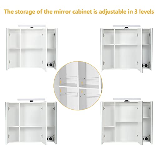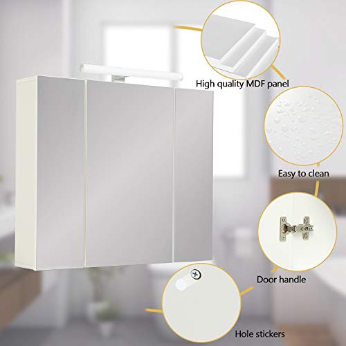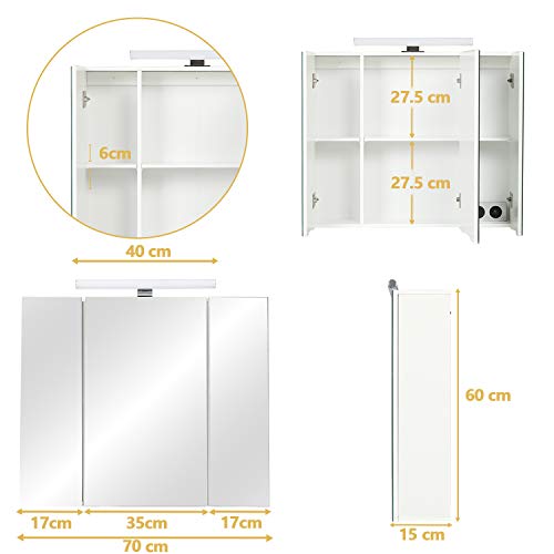 DICTAC Armadietto bagno con luce, contenitore con Illuminazione LED e Presa 70 x 60 x 15 cm con specchio e 3 Ante e conservazione mobile,Bianco
