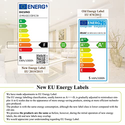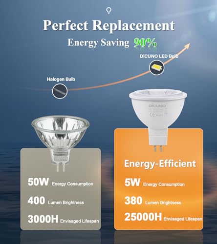 ⭐【Risparmio energetico】DiCUNO lampadina LED MR16 GU5.3 5W può sostituire perfettamente la lampadina alogena da 50W, risparmiando fino al 90% sulla bolletta dell'illuminazione. La durata della vita è fino a 25.000 ore, il che ridurrà i costi riducendo la frequenza di sostituzione. Può essere utilizzato solo sotto 12V.