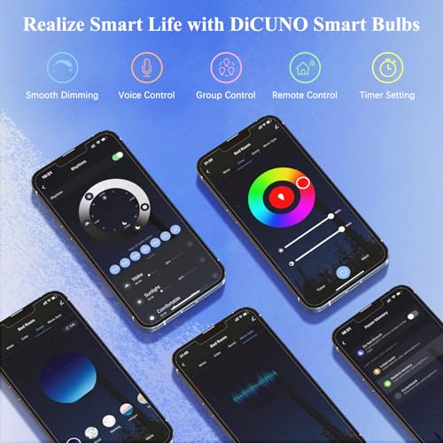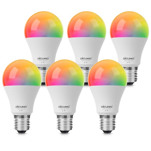 DiCUNO Lampadine Wi-Fi LED Inteligente E27, Lampadine Intelligenti con Alexa e Google Home, 9W Dimmerabile Multicolore 2700K-5000K RGBCW, 800LM Equivalente 60W, Nessun Hub Richiesto, 6 Pezzi