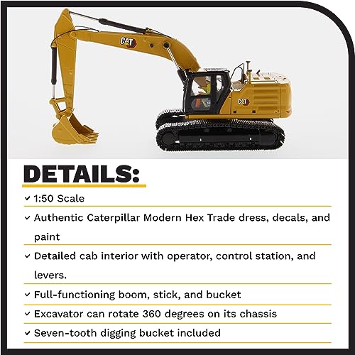Replica in scala autentica con dettagli eccezionali: l'escavatore idraulico Diecast Masters Caterpillar 323 in scala 1:50 include vernice esagonale moderna Caterpillar accurata e attuale, decalcomanie e abiti commerciali. Il modello è dotato di un braccio funzionante, un bastone e un secchio di scavo a sette denti (non rimovibile) che possono essere posizionati in diverse opzioni di visualizzazione di scavo, i pod GPS possono essere trovati sulla parte superiore del modello e il modello può essere ruotato di 360 gradi sul suo telaio.