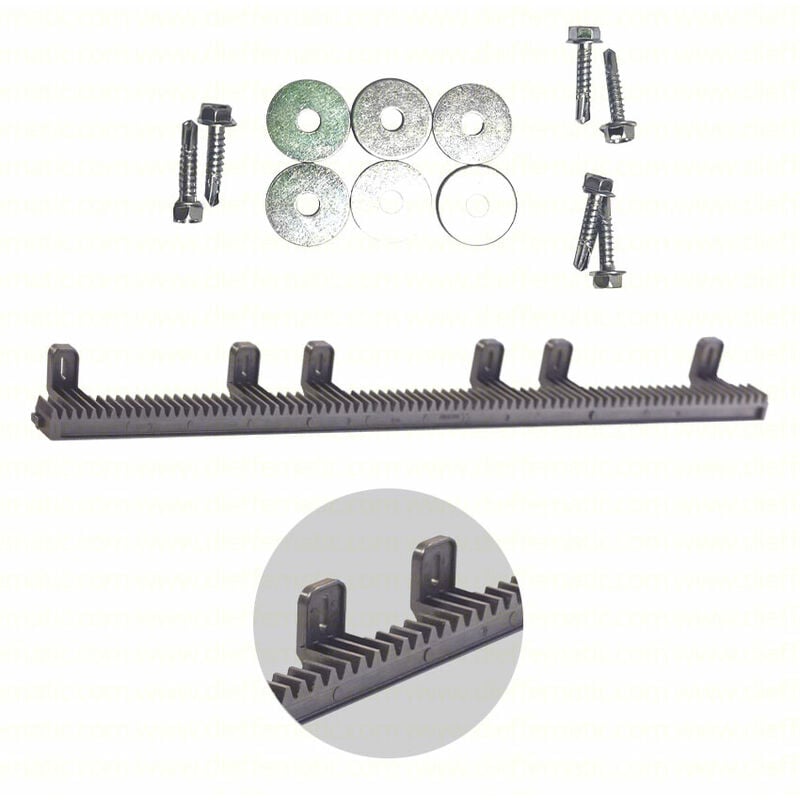 CREMAGLIERA UNIVERSALE ANTIUSURA IN NYLON PER CANCELLO SCORREVOLE + VITI DI FISSAGGIO Cremagliera per cancelli scorrevoli, lunghezza 1 Mt, con incastri a coda di rondine per effettuare il montaggio in successione. Composizione in nylon rinforzato con fibra di vetro e anima composta da un esagono di 8mm in acciaio che dona alla cremagliera resistenza e rettilineità. E composta di 6 attacchi fissi e modulo del dente standard M4. Modulo 4 Altezza 27.5 mm Profondità cremagliera 20 mm Profondità cremagliera con attacchi 40 mm Nella confezione con 6 viti 5.5x25 mm e 6 rondelle 6x32 mm per metro. Garanzia 24 mesi