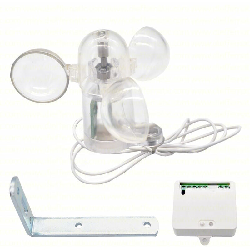 SENSORE VENTO PER VARIE APPLICAZIONI Professionale Universale INFORMAZIONI GENERALI Dispositivo universale dotato di un anemometro, che rileva la velocità del vento. Dotato di centrale dedicata, per trasformare un segnale in contatto pulito normalmente aperto NA o chiuso NC E' facile da installare e da gestire e costituisce un ottimo ed elegante sistema di protezione. Questo sensore è costituito da una parte fissa e da una parte mobile (asse rotante con 3 palette). Il dispositivo va installato ove possa rilevare la presenza di vento, quindi non in posizioni riparate da muri o sporgenze Garanzia 24 mesi