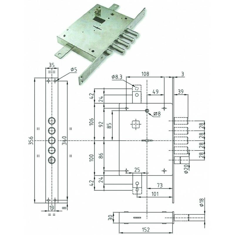 SERRATURA TRIPLICE APPLICARE CON SCR. DOPPIA MAPPA BLIND. HEAVY MM.73 - mm.73 DX (IMB 7111 2 DE) imballo industriale serrature a doppia mappa per porte blindate serie HEAVY con scrocco azionato da chiave e da quadro maniglia - 5 catenacci - interasse mm.28 - finitura zincata - la serratura è corredata di astuccio sigillato con 3 chiavi mm.92 e blocchetto e 1 chiave di prova