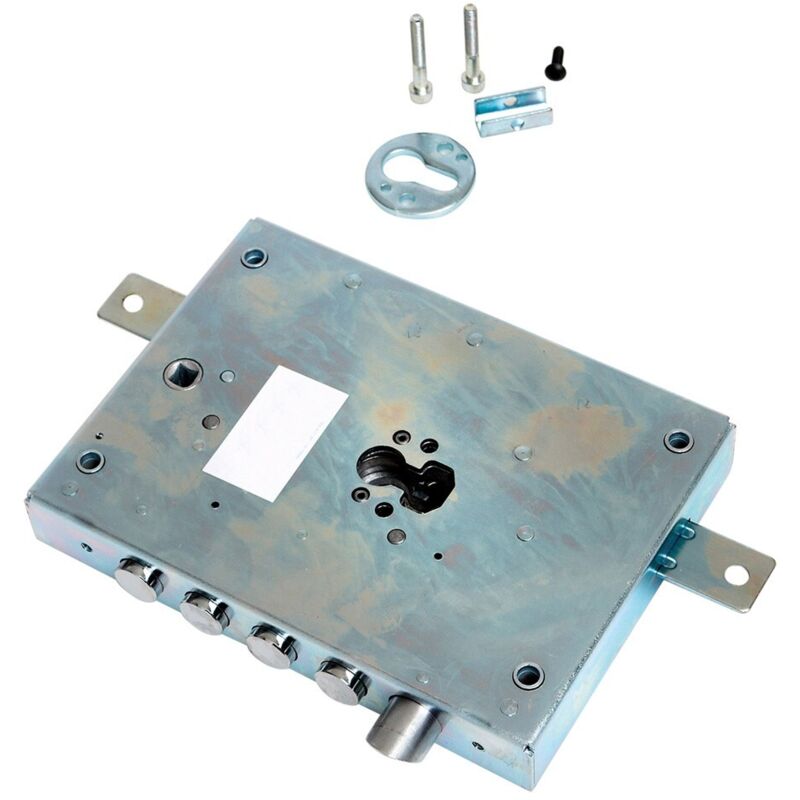 In scatola. Per cilindro a profilo europeo. A 3 mandate, scrocco azionato da chiave o maniglia. Ingranaggi con sistema antimanipolazione, quadro maniglia 8 mm, interasse 85 mm, 4 catenacci, corsa 40 mm. Predisposizione per applicazione aste. Montaggio cilindro con viti passanti e staffa di bloccaggio. Realizzata in acciaio zincato. Completa di mostrina, staffa di bloccaggio e viti fissaggio. Per porte blindate.. art.42.7 - Dx E 70 mm 152 x 206. Prezzo inteso per: 1 PZ