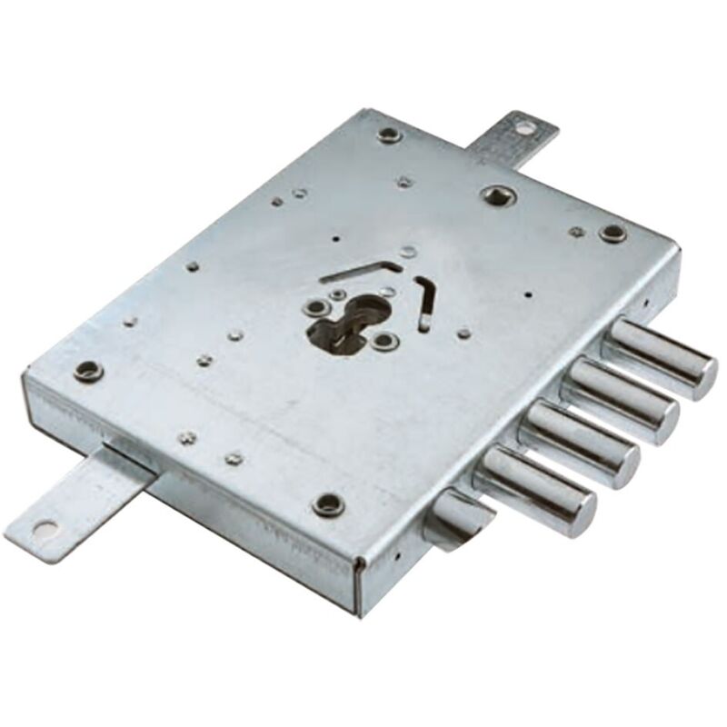 In termopacco. Per cilindro a profilo europeo. A 3 mandate, scrocco azionato da chiave o maniglia. Ingranaggi con sistema antimanipolazione, quadro maniglia 8 mm, interasse 85 mm, 4 catenacci, corsa 40 mm. Predisposizione per applicazione aste. Montaggio cilindro con viti passanti e staffa di bloccaggio. Realizzata in acciaio zincato. Per porte blindate.. art.42 - Sx E 60 mm 142 x 206. Prezzo inteso per: 1 PZ