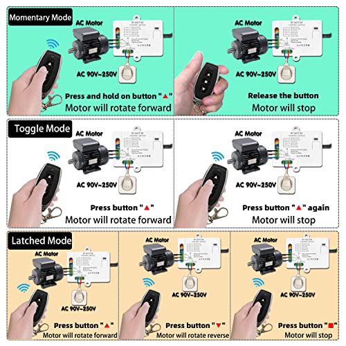 【Più flessibilità】 Questo ricevitore può connettersi facilmente al motore CA. Ogni ricevitore può memorizzare circa 20 trasmettitori. E un trasmettitore può controllare anche più ricevitori. Diversi kit di telecomando possono essere utilizzati nella stessa stanza, senza interferenze l'uno con l'altro (ad eccezione dell'uso in modalità momentanea).
