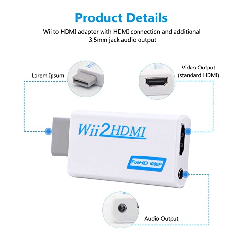 DIFCUL Convertitore da Wii a HDMI, Adattatore wii Hdmi Video Full HD 60Hz 720P/1080P audio da 3,5 mm cavo HDMI da 1,5 m per Tutte le Modalità di Visualizzazione della console Wii, Giochi, TV (Bianco)