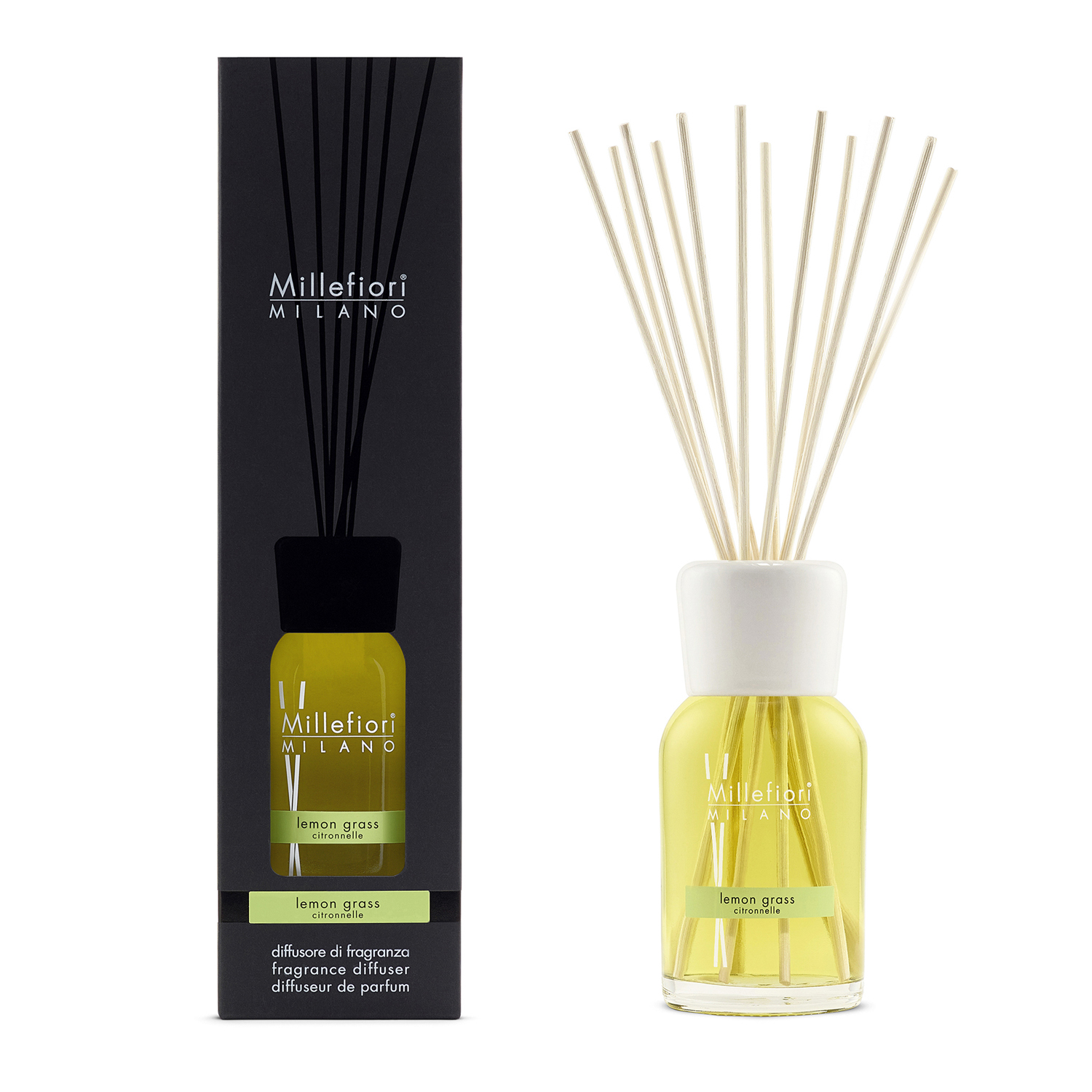 Millefiori è la linea di diffusori di fragranze vivace e colorata, ideale per donare un tocco personale e profumato ad ogni ambiente della tua casa. Grazie alla pratica boccetta completa di essenza e di bastoncini in legno, potrai diffondere una fragranza luminosa e frizzante che ricorda il profumo degli agrumi, foglie di verbena e fresche note floreali sul fondo. I bastoncini garantiscono un rilascio graduale e prolungato e puoi girarli ciclicamente per una migliore diffusione della profumazione. Il diffusore ha una capacità di 500 ml. Fragranza: Lemon Grass. Dimensione: 35x9 cm.