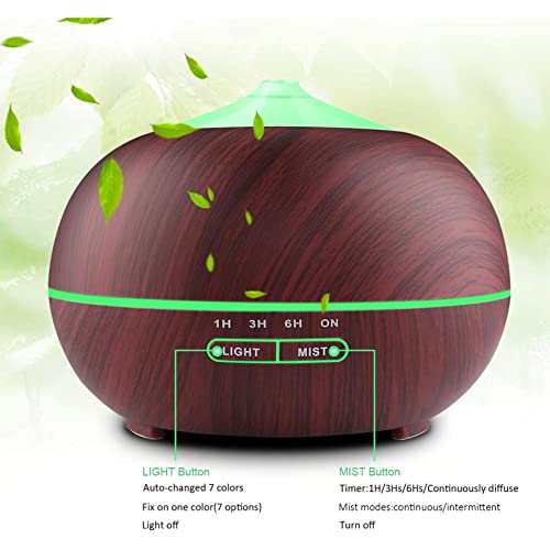 Diffusore di oli essenziali per aromaterapia: il diffusore per aromaterapia con venature del legno funziona da 6 a 10 ore con 3 timer (1H / 3H / 6H) e continuo. 2 modalità di nebbia fredda regolabili. Il diffusore ha un serbatoio d'acqua da 400 ml e il coperchio si può facilmente rimuovere per poter riempire acqua o oli essenziali. Facile da pulire.