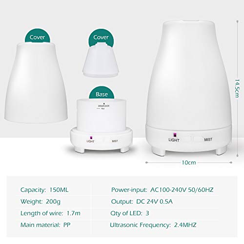 Diffusore di Oli Essenziali 150ml, GeeRic Mini Diffusore Aromaterapia Umidificatore Ultrasuoni Umidificatore 7 Colori LED Diffusori di Aroma Silenzioso per Yoga Regalo,Bianco