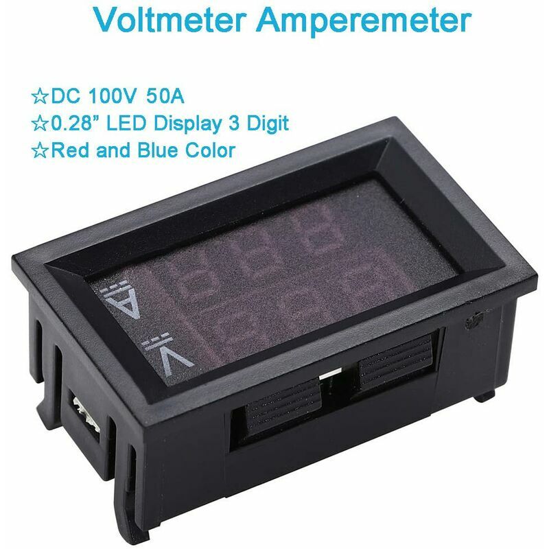 corrente 0-50A. APPLICAZIONI - monitoraggio batterie, pannelli solari, modellini di treni, camper, motociclette, batterie domestiche, motori, ecc. DISPLAY - Un chiaro e luminoso 0.28'' Lo schermo LED visualizza il valore della tensione (rosso) e della corrente (blu). CALIBRAZIONE - con potenziometro di calibrazione della tensione e della corrente. NOTA - lo shunt deve essere collegato durante il cablaggio, altrimenti il contatore verrà bruciato.